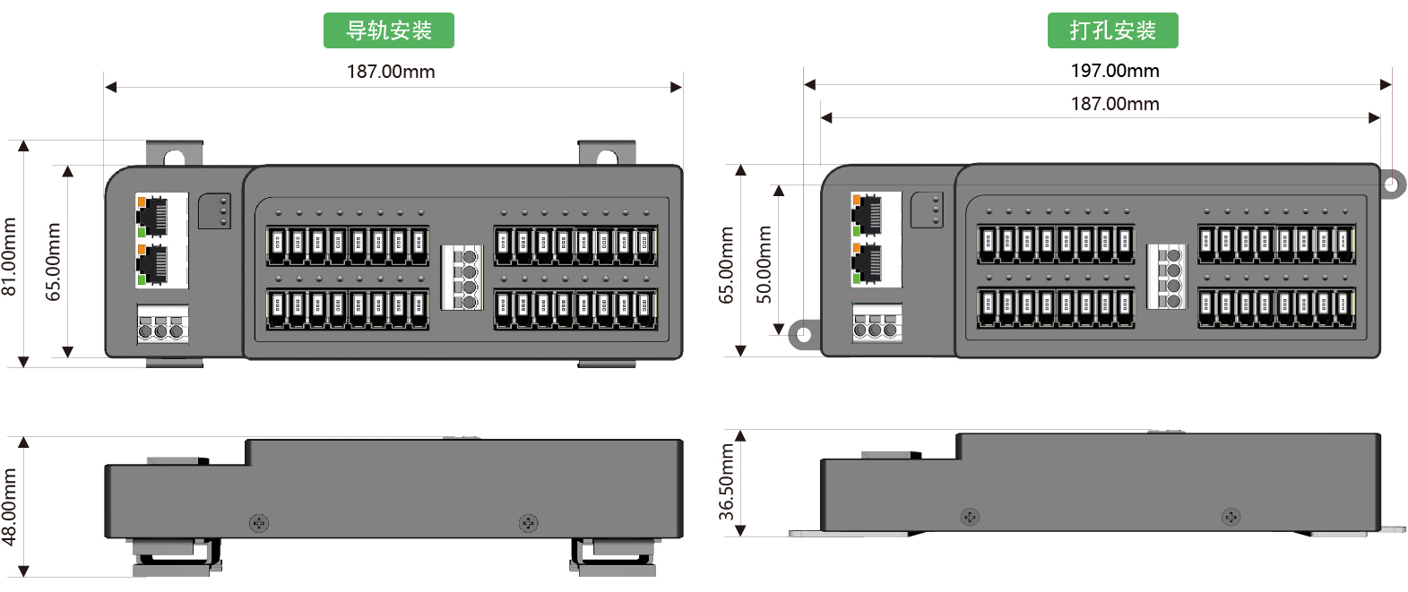 安裝方式:DIN35導軌安裝或雙側耳打孔安裝